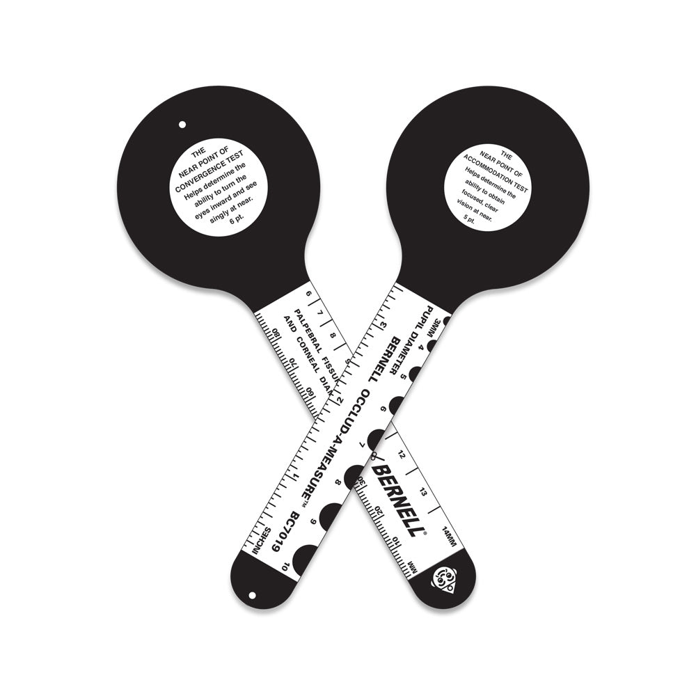 Inexpensive device that fulfills eight functions. Use as an occluder, measure inter-pupillary distance, palpebral fissure height, corneal diameter, pupillary diameter, near point of accommodation, and near point of convergence with dot or small clown target.